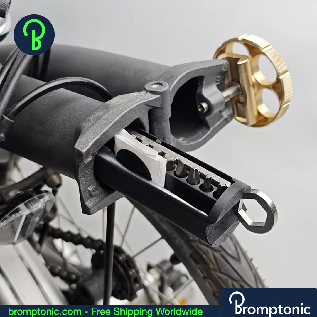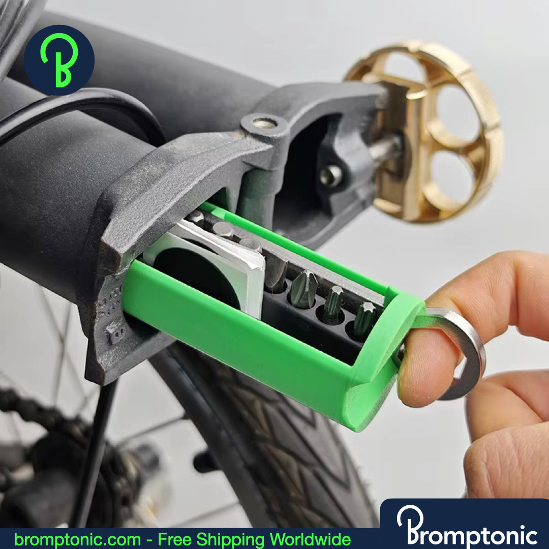 Gardez vos outils essentiels bien cachés à l'intérieur du cadre de votre Brompton grâce à cette boîte à outils magnétique cachée - une conception intelligente qui allie style, praticité et fiabilité.